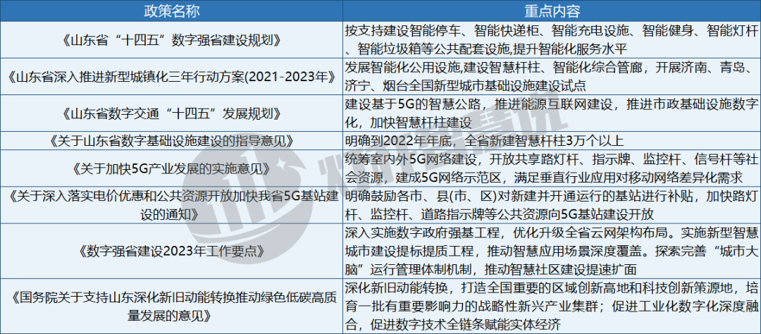 從匯總到的政策來看,山東省從數(shù)字基礎(chǔ)設(shè)施、智慧交通、城鎮(zhèn)化轉(zhuǎn)型等方面都重點提及到了智慧燈桿。